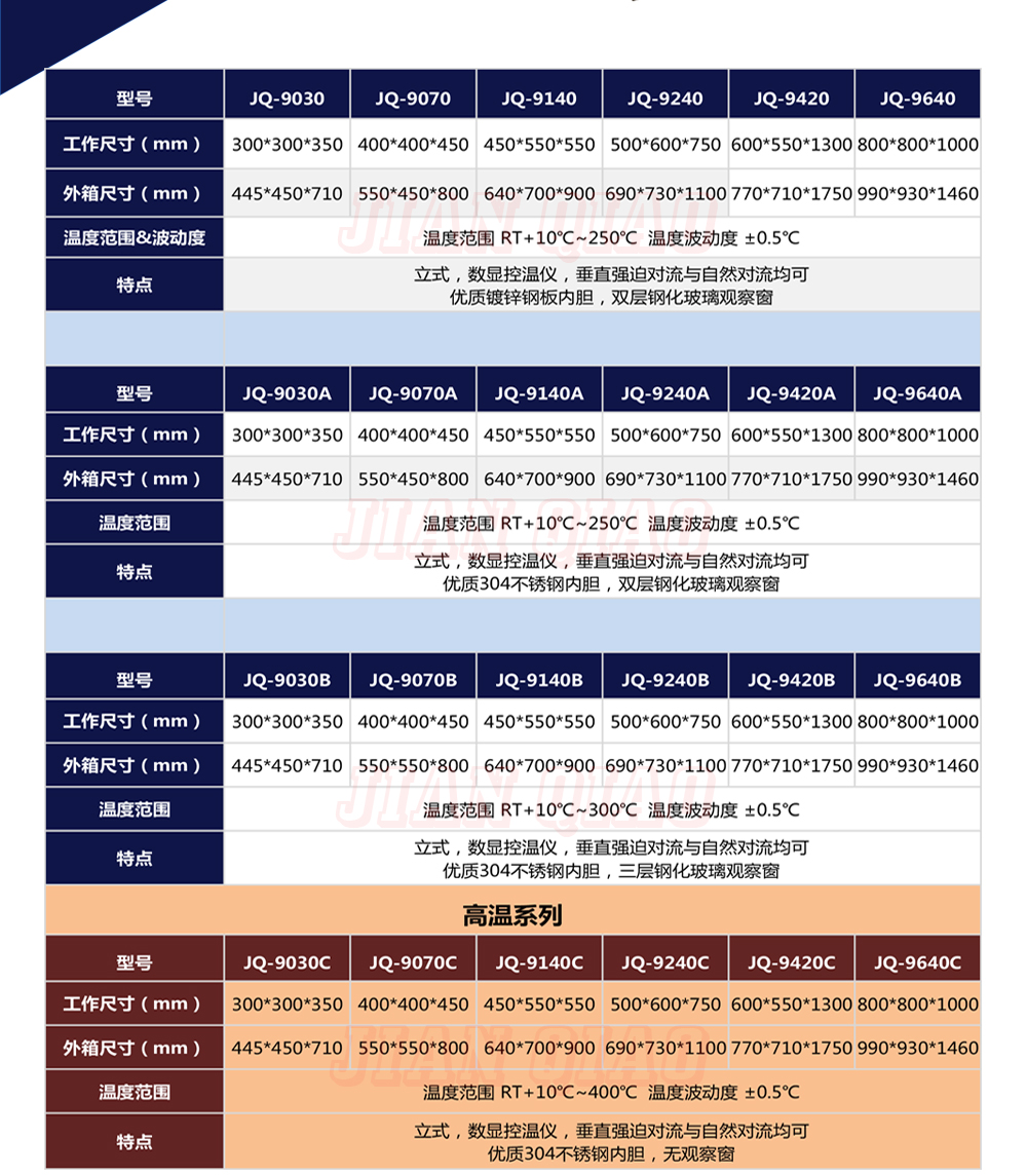 產品型號:JQ-9640 品牌:劍 喬 用途:精密高溫箱用于對電子電工、汽車摩托、航空航天橡膠、塑膠、金屬、船舶兵器、高等院校、科研單位等相關產品的零部件及材料在高溫恒溫變化的情況下,檢驗其各項性能指標。咨詢熱線:13829135130